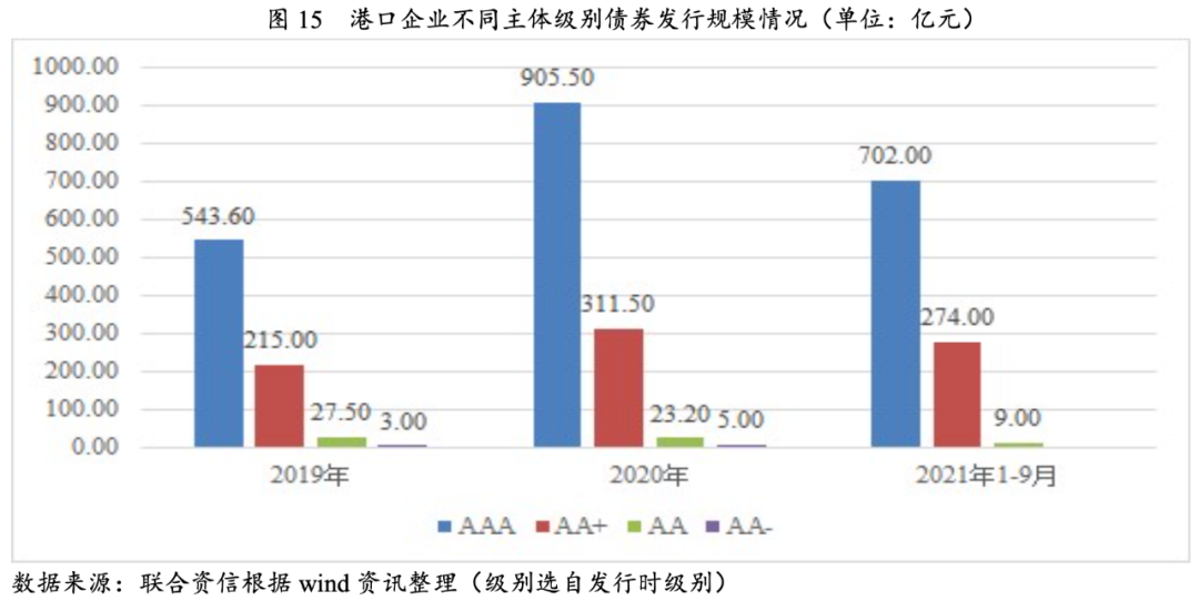 從發(fā)債主體級(jí)別來(lái)看,2020年,AAA、AA+、AA級(jí)別港口企業(yè)債券發(fā)行期數(shù)分別為96支、70支和5支,占比分別為55.81%、40.70%和2.91%;發(fā)行規(guī)模分別為905.50億元、311.50億元和23.20億元,占比分別為72.20%、24.84%和1.85%。2021年前三季度,AAA級(jí)別企業(yè)發(fā)債期數(shù)最多,共計(jì)發(fā)行75支債券(占55.56%),發(fā)行規(guī)模合計(jì)702.00億元(占71.27%),各級(jí)別企業(yè)發(fā)債支數(shù)和規(guī)模占比較2020年全年水平變化不大。