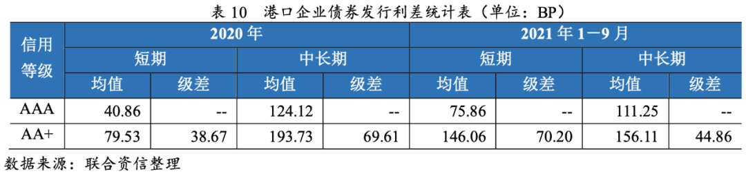 2021年以來(lái),港口企業(yè)短期發(fā)行利差整體呈波動(dòng)上升趨勢(shì),長(zhǎng)期發(fā)行利差相對(duì)穩(wěn)定,AA+級(jí)短期級(jí)差走闊,AA+級(jí)中長(zhǎng)期極差有所收縮。