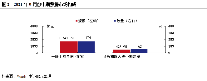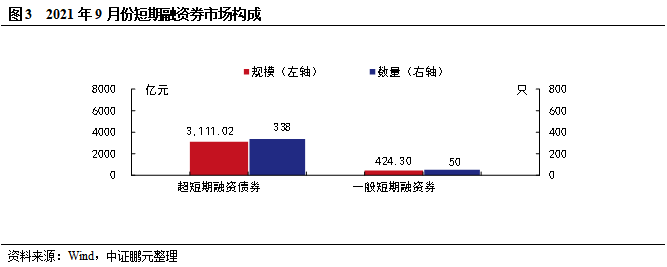 9月發行的中期票據中包括特殊期限含權中期票據62只,發行規模498.90億元。9月發行的短期融資券中包括超短融(SCP)338只,發行規模3,111.02億元。