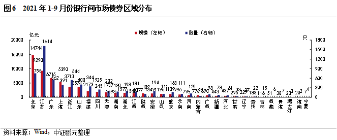 2021年9月份,銀行間市場發行債券廣泛分布于27個?。ㄖ陛犑?、自治區)。從發行規模來看,北京以1,313.50億元的發行規模遙遙領先,江蘇、廣東、上海和浙江位列第二梯隊,發行規模在350-900億元之間。從發行數量來看,江蘇排名第一、北京排名前二,浙江、廣東、上海發行數量緊隨其后,均超過30只。綜合2021年1-9月的情況來看,銀行間市場債券的發行主導區域仍集中在北京、江蘇和廣東等地區。從發行規模來看,北京以14,743.65 億元的發行規模領先于其他省市,江蘇、廣東和上海緊隨其后。從發行數量來看,江蘇發行1,614只,位居第一;北京發行755只,位居第二;廣東發行562只,位列第三。