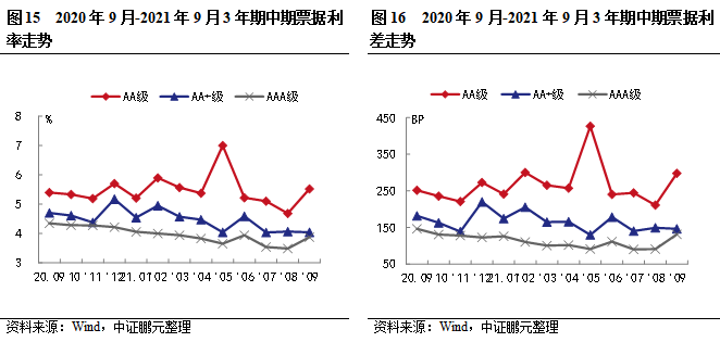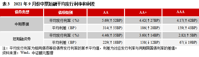 2021年9月份,中期票據的最高發行利率為8.00%,比上月最高發行利率上升50 BP;最低發行利率為2.88%,比上月最低發行利率下降2BP。與2021年8月份相比,AA級、AA+級別、AAA級的平均發行利率分別上升52BP、27BP和42BP;平均利差分別擴大55BP、擴大28BP和收窄43BP。9月份短期融資券的最高發行利率為7.00%,與上月最高發行利率持平;最低發行利率為2.00%,與上月最低發行利率持平。就短期融資券發行級別來看,AA級、AA+級別、AAA級的平均發行利率分別上升35BP、14BP和5BP;平均利差分別擴大18BP、收窄12BP和收窄19BP。