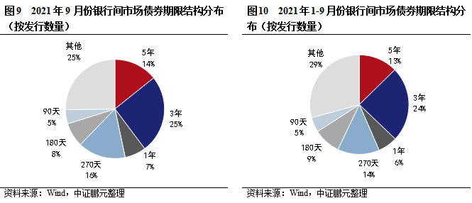 期限方面,9月銀行間市場債券期限集中度同比略有下降,主要期限的發行規模占比較上月漲跌互現。