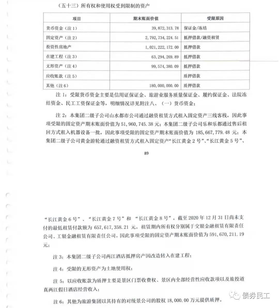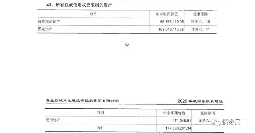 2、從重慶旅投公布的2020年審計報告來看,對于受限資產的描述同樣是按照會計科目進行的,在表格下進行了對受限資產進行了簡要的匯總描述,沒有針對每筆首先資產的情況進行介紹。