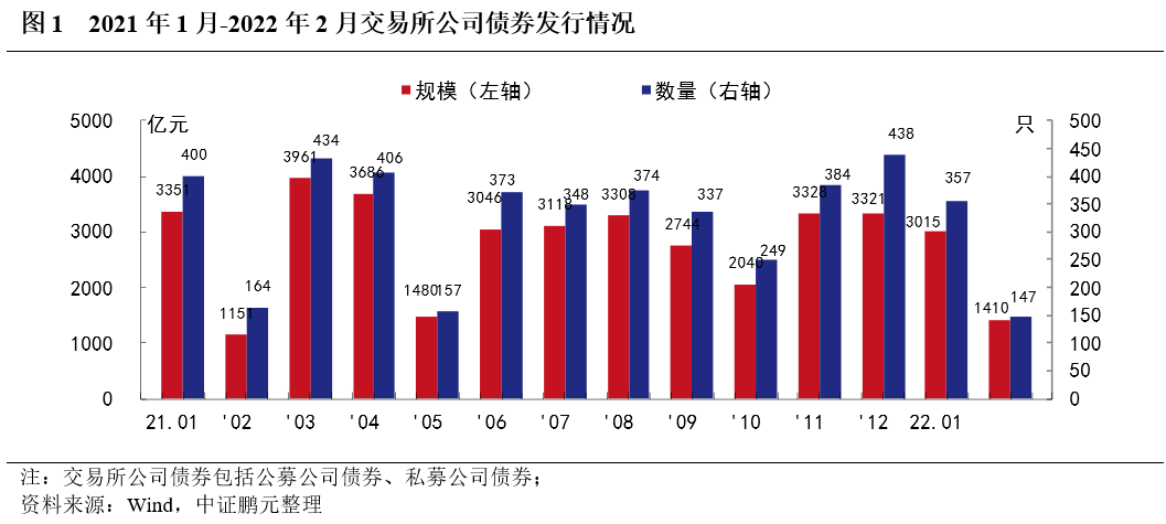 2022年2月份,交易所市場共發行信用債券155只,發行規模1,709.10億元;發行數量和發行規模環比分別下降57%和45%,同比分別下降8%和增長45%。其中,公募公司債發行70只,發行規模843.05億元,環比分別下降48%和46%,同比分別增長112%和120%;私募公司債發行77只,發行規模567.00億元,環比分別下降65%和61%,同比分別下降41%和26%。交易所公司債凈融資723.88億元,環比下降53%。