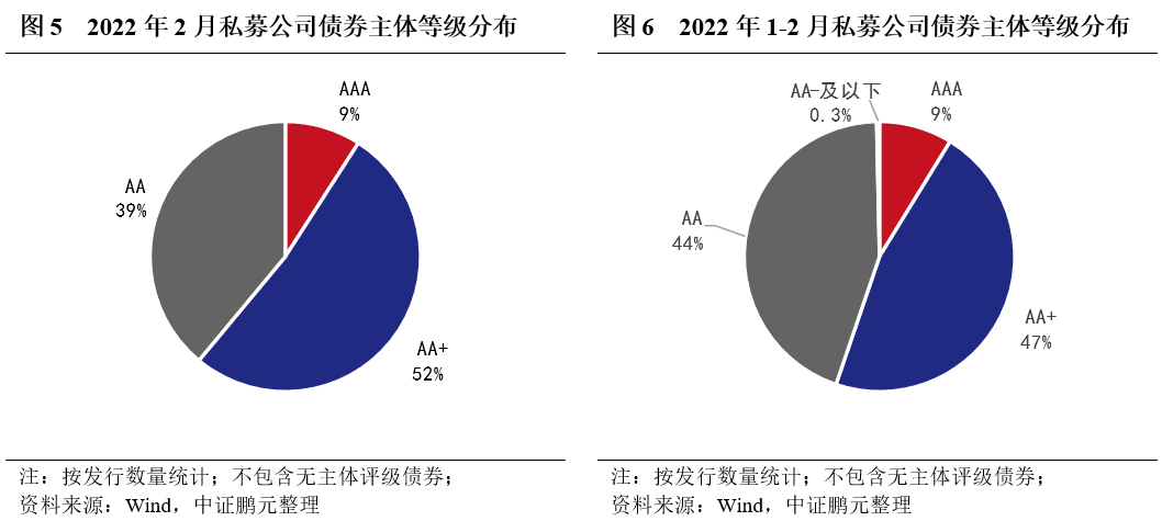 綜合2022年1-2月份的情況來看,交易所公司債券主體級別仍以中高等級為主,AAA級、AA+級、AA級主體評級占比分別為37%、35%、27%。其中,公募公司債AAA級、AA+級、AA級及AA-及以下主體評級占比分別為77%、20%、3%,0.5%;私募公司債AAA級、AA+級、AA級及AA-及以下主體評級占比分別為9%、47%、44%、0.3%。