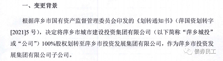 3、2021年12月1日,萍鄉(xiāng)市城市建設(shè)投資集團(tuán)有限公司公告,將公司100%股權(quán)劃轉(zhuǎn)至萍鄉(xiāng)市投資發(fā)展集團(tuán)有限公司,作為萍鄉(xiāng)市投資發(fā)展集團(tuán)有限公司子公司。