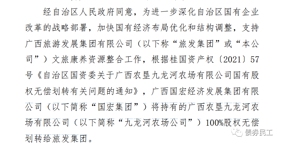 1、2021年12月8日,廣西旅游發(fā)展集團(tuán)有限公司披露公告,廣西國宏經(jīng)濟(jì)發(fā)展集團(tuán)有限 公司將持有的廣西農(nóng)墾九龍河農(nóng)場有限公司100%股權(quán)無償劃轉(zhuǎn)給旅發(fā)集團(tuán)。