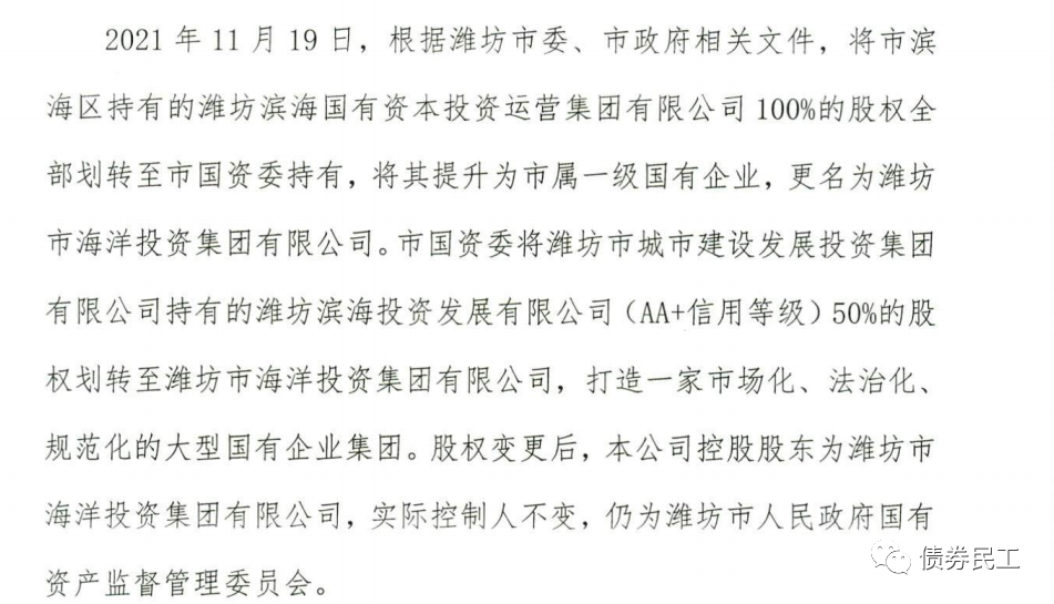 5、2021年11月19日,濰坊濱海投資發(fā)展有限公司公告,市國資委將濰坊市城市建設(shè)發(fā)展投資集團(tuán)有限公司持有的本公司50%的股權(quán)劃轉(zhuǎn)至濰坊市海洋投資集團(tuán)有限公司。