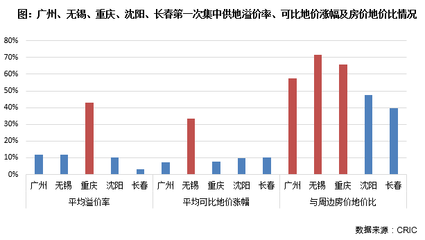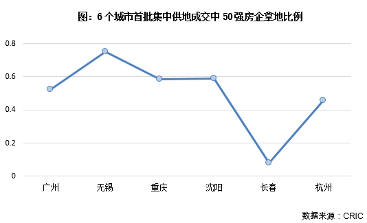 首批集中拍地的城市地市熱度不一,廣州、重慶、無錫和杭州熱度明顯高于長春和沈陽,50強房企在前4個城市投資的積極性也明顯更高。