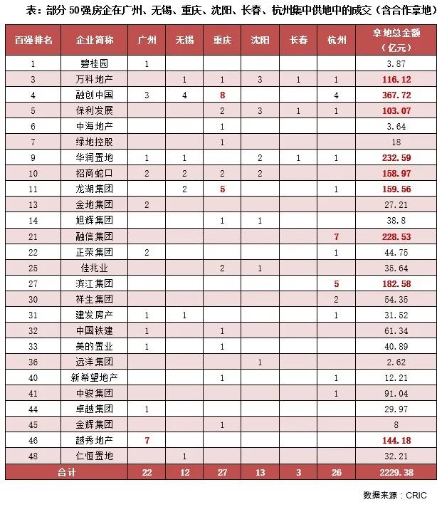 本次統計的6個集中拍地的城市中,拿地較多的龍頭房企如萬科、融創、保利、華潤和招商在其中4-5個城市均有落子,萬科除了廣州以外均有所斬獲、華潤則在重慶以外的城市都有土地入賬。