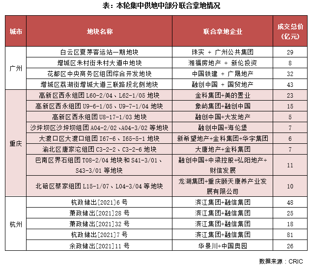 在TOP50房企積極拿地、規模房企優勢盡顯的同時,部分中小房企則通過聯合拿地的方式在招拍掛市場上尋求突破。湘福房地產和新輪投資共同競得廣州增城區1宗總價7.7億元的地塊,廣晟地產則與中國鐵建聯合競得花都區一宗總價31.9億元的地塊,此外重慶、杭州也有多宗聯合拿地的地塊。