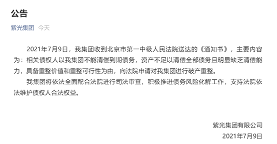2021年7月9日,紫光集團發(fā)布公告稱,收到北京市第一中級人民法院送達的《通知書》,主要內容為:相關債權人以紫光集團不能清償?shù)狡趥鶆眨Y產(chǎn)不足以清償全部債務且明顯缺乏清償能力,具備重整價值和重整可行性為由,向法院申請對紫光集團進行破產(chǎn)重整。