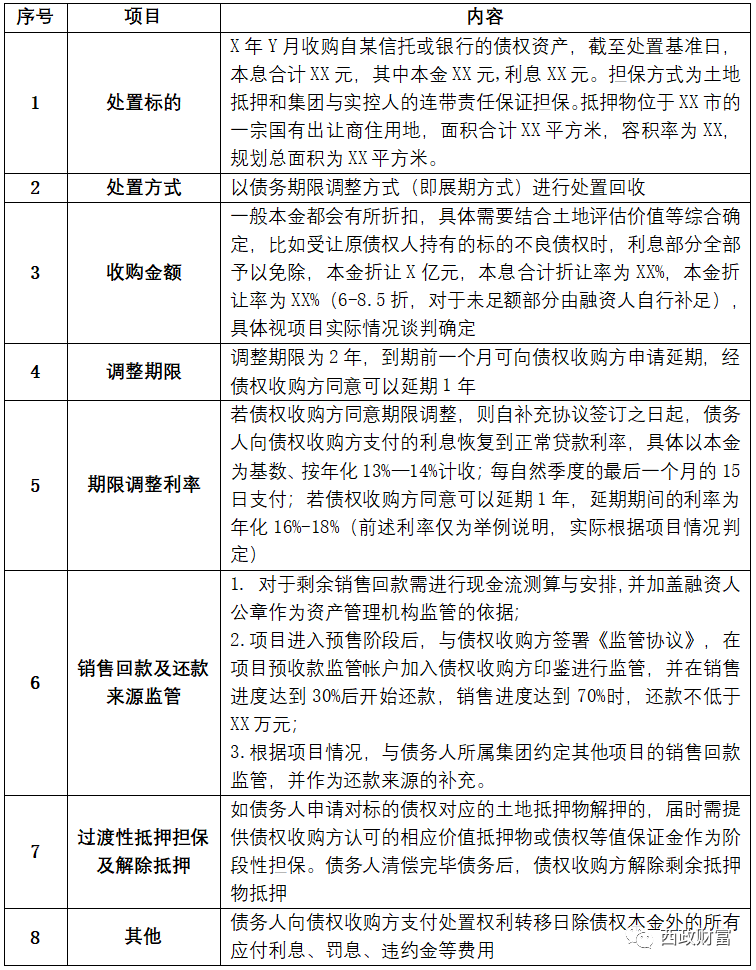 資產管理公司打折收購銀行、信托等機構對開發商的到期債權是不良處置業務的常見模式,資產管理公司收購債權后的處置方案中,債務期限調整、訴訟清收以及公開轉讓是最常見的三種方式。其中,資產管理公司收購到期債權后給予債務人展期是最常規的債務處置思路,在該操作過程中,由資產管理機構打折(6折-8.5折,具體一事一議)收購銀行或信托等金融機構對開發商的到期債權,對于債務人有強烈的期限調整意向,并愿意按照一定年利率向債權收購方支付利息的,資產管理公司一般都會準予債務人在兩年內或約定時間內清償全部債務。此外,考慮到抵押物的位置較為優越以及抵押率較為理想的情況下,在資產管理機構(債權收購方)認為抵押物具備變現能力的情況下,一般都可給予該債務一定的寬限期。具體融資要素示例如下: