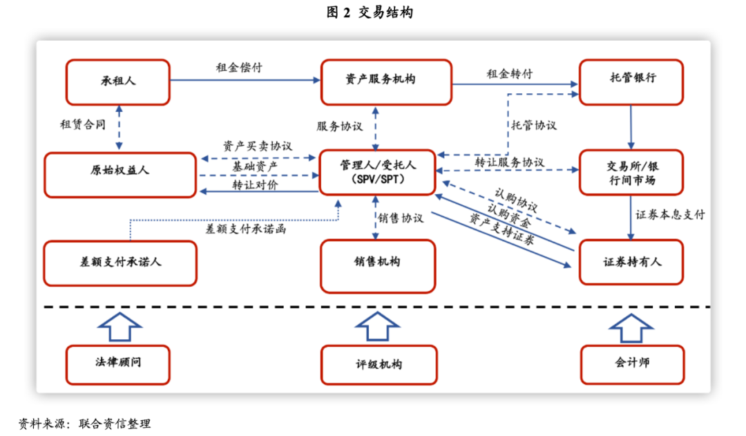 融資租賃債權資產證券化是以租賃資產為基礎資產,由商業融資租賃公司/金融租賃公司作為原始權益人發行設立的資產證券化產品。根據發起主體經營性質的不同,主要分為融資租賃和金融租賃,前者可在交易所、保交所和銀行間債券市場發行企業ABS和ABN,而后者僅可在銀行間債券市場發行信貸ABS,并由銀保監會進行監管審批。租賃資產ABS化能夠在很大程度上拓寬融資租賃公司的融資渠道、降低融資成本、提高資金流轉速度、優化資產負債結構并部分轉移和降低經營風險,相對于傳統的債項融資工具有著較為明顯的優勢。交易結構如下圖所示。
