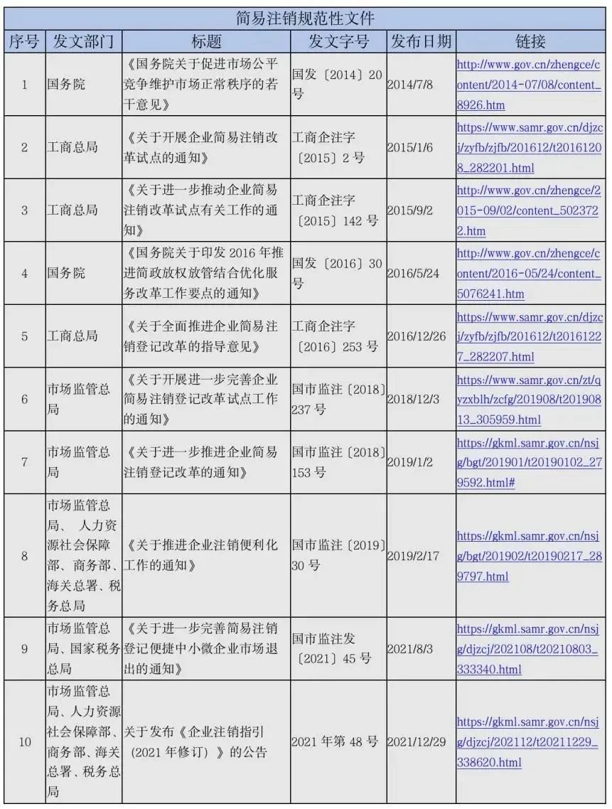以此為背景,國家推出簡易注銷制度。伴隨著相關(guān)部門相繼出臺(tái)以下文件,簡易注銷制度不斷完善: