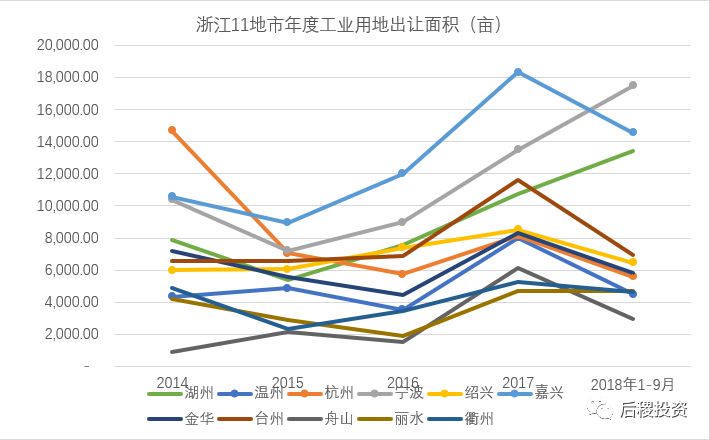 浙江一直是人多地少的省份,隨著2015年開始的資產價格上升,浙江各地政府紛紛開始實施“三改一拆”、“沿邊整治”、“騰籠換鳥”、“畝產改革”等運動,消減了大量非規范工業用地供應,提升了新增工業用地的供地門檻(投入及稅收層面),使得供需矛盾進一步激化。
