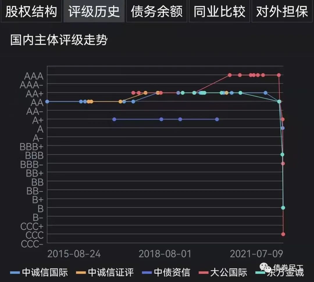 藍(lán)光發(fā)展的實(shí)際控制人是楊鏗,是四川省最大的房地產(chǎn)開發(fā)公司,位列2020年中國(guó)房地產(chǎn)企業(yè)銷售排行榜操盤金額第39位。。藍(lán)光發(fā)展的評(píng)級(jí)機(jī)構(gòu)包括中誠(chéng)信國(guó)際、大公國(guó)際和東方金誠(chéng),主體信用評(píng)級(jí)最高達(dá)到AAA,目前最新評(píng)級(jí)為CCC。近年來(lái),藍(lán)光發(fā)展的信用評(píng)級(jí)經(jīng)歷了大起大落,評(píng)級(jí)變動(dòng)主要是集中在2021年6月份以來(lái)。此次債券違約之后,預(yù)計(jì)主體信用評(píng)級(jí)可能會(huì)進(jìn)一步下調(diào)。