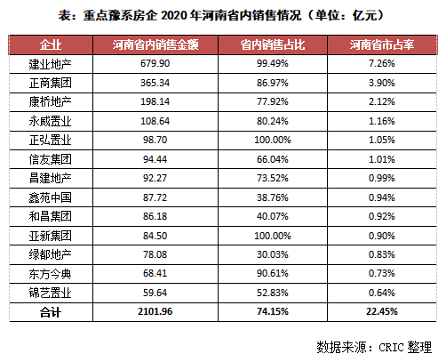 從上榜的13家豫系房企的銷售區域分布來看,2020年這13家企業在河南省內的銷售金額約為2102億元,對其總銷售額的占比約為74.15%,可見重點豫系房企的合約銷售金額主要仍來自于河南省。與此同時,根據河南省2020年房地產銷售金額9364.36億元計算,這13家豫系房企在河南省的市占率約為22.45%,豫系房企在本省的市占率仍有待提高。