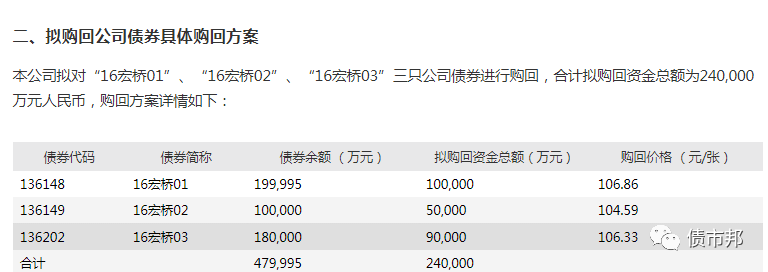 但后來細細一分析,不對啊,宏橋回購方案只是針對3筆馬上要在明年1月份到期的公司債,就連2月份要到期的16宏橋05都不愿意帶上。所以別看這三筆待回購債券的到期收益率高,但是凈價和面值差的不多。