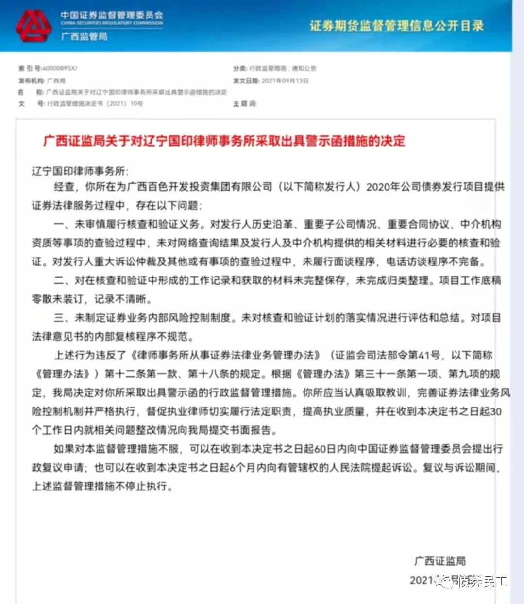 根據(jù)廣西證監(jiān)局2021年9月13日披露的公開信息,遼寧國(guó)印律師事務(wù)所因?yàn)樵趶V西百色開發(fā)投資集團(tuán)有限公司2020年公司債券發(fā)行項(xiàng)目中存在未審慎履行核查和驗(yàn)證義務(wù)、未完整保存和歸類整理盡調(diào)底稿、未制定證券業(yè)務(wù)內(nèi)部風(fēng)險(xiǎn)控制制度等問題,被廣西證監(jiān)局采取出具警示函措施。根據(jù)公開信息,遼寧國(guó)印律師事務(wù)所為“20百投01”、“20百投02”和“20百投03”提供了證券法律法務(wù)。