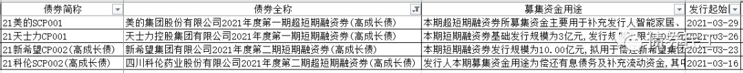 7、目前公告發行的高成長債債券期限以短期為主,21科倫SCP002(高成長債)為180天,21美的SCP001為178天,其余的債券期限均為1年。