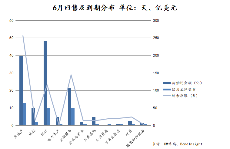 從時間分布上看,償債壓力在6月集中在頭、尾部,分別在6月1日及6月28日出現(xiàn)兩波兌付高峰。其中6月1日單日有4筆債券面臨回售或到期兌付,涉及金額高達28億美元,為本月單日最高待還金額;單日最多筆數(shù)則是6月28日,共計5筆債項需兌付。