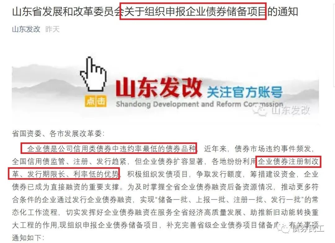 山東省發改委于2021年11月9日印發的《關于組織申報企業債券儲備項目的通知》直接在債券民工的朋友圈刷屏了,明確提出“企業債券是違約率最低的債券品種”,具備“注冊制改革、發行期限長、利率低”的優勢。