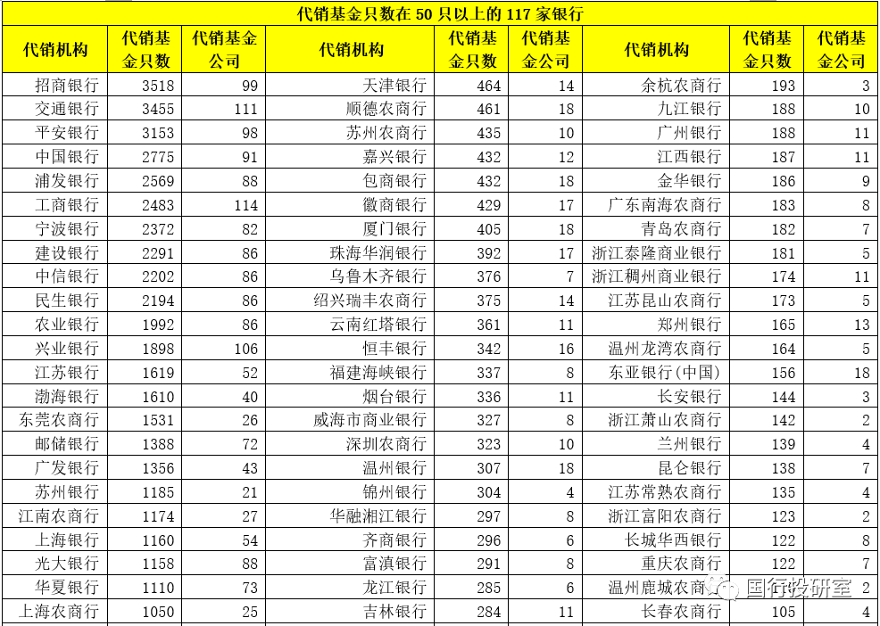 北京銀行、杭州銀行、微眾銀行、泉州銀行、東莞銀行、青島銀行、晉商銀行、南京銀行、北京農商行、中原銀行、大連銀行、浙商銀行、西安銀行、天府銀行、河北銀行與哈爾濱銀行等16家銀行的代銷基金只數均超過500只。