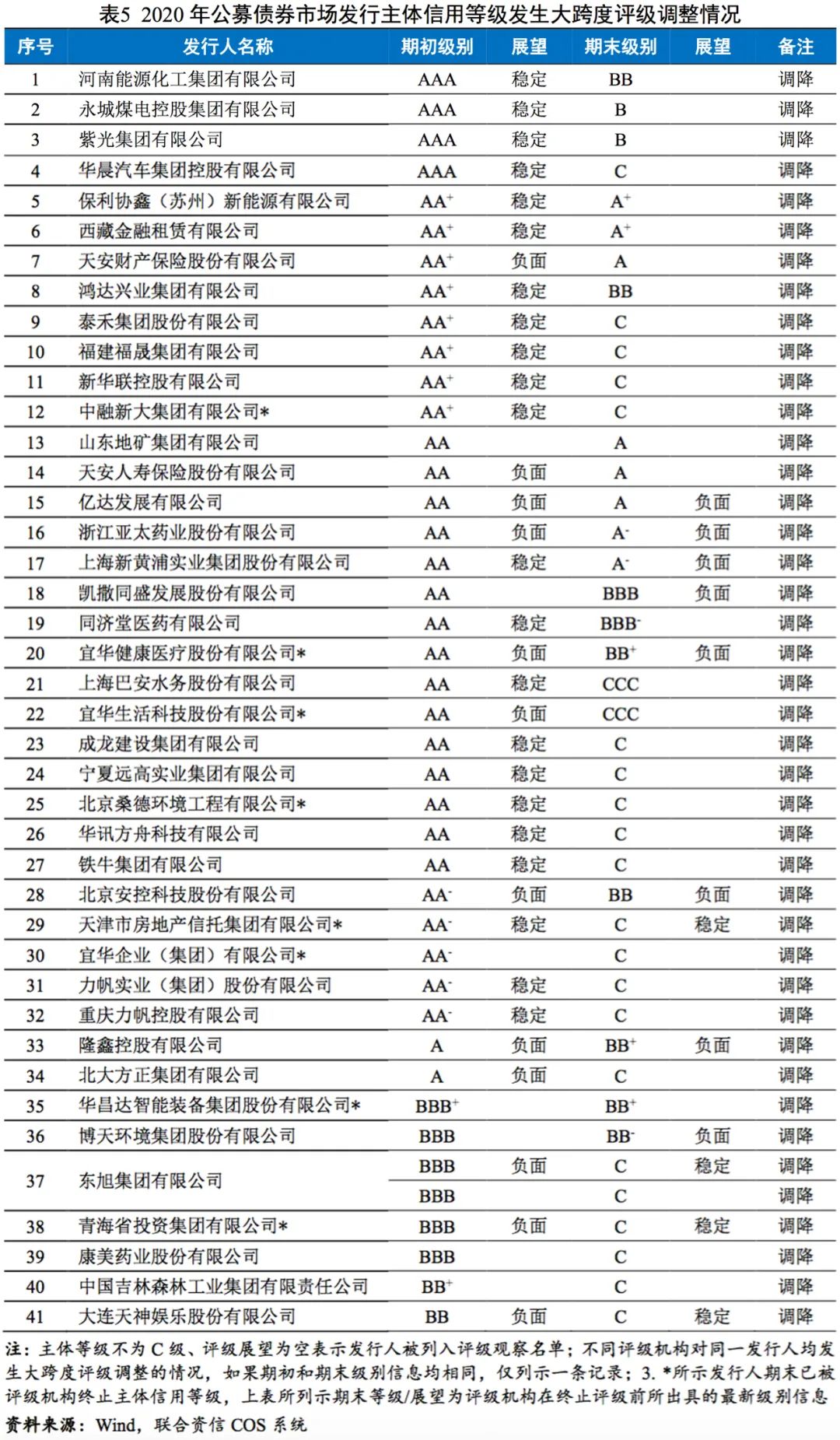 等級調整方面,發行人信用等級調整率變化不大,整體仍呈調升趨勢;企業性質方面,國有企業調整率同比上升,民營企業調整率同比下降,弱資質民營企業信用風險持續出清,存量發行人整體信用狀況有所改善,而國有企業信用風險出現一定程度分化,部分國有企業違約風險開始暴露;行業和地區方面,部分行業信用風險出現分化,等級調整無明顯地域特征;此外,大跨度評級調整數量有所減少。信用等級遷移方面,截至2020年末AAA級、AA+級發行人占比進一步上升,各級別穩定性整體表現良好,AA+級至A+級呈向上遷移趨勢。