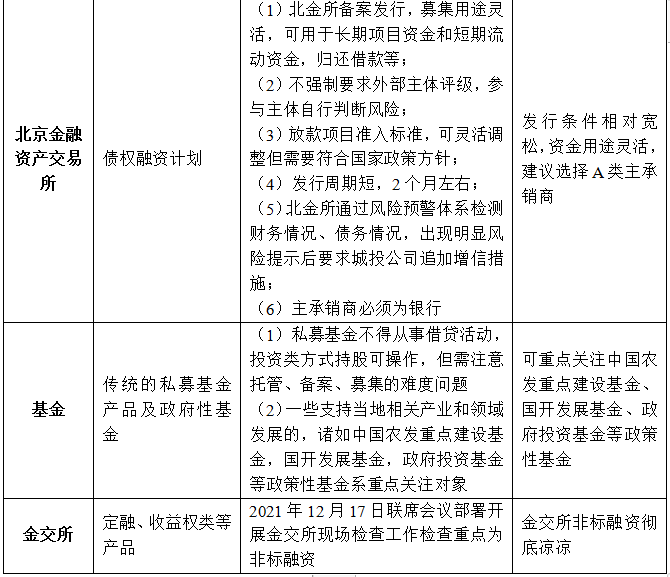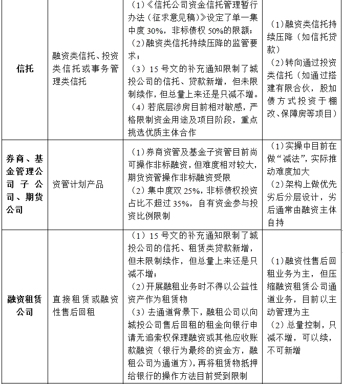 以下結合我們目前與信托機構合作的投資類信托參與城投平臺融資以及當前尚存在操作空間的北金所債權計劃、融資性售后回租等幾類非標融資方式對常規(guī)的操作要求及內容進行說明。除此之外,上文提及的通過融資性信托、保險資管計劃或債權計劃、政策性基金、券商或基金子資管計劃等亦可作為溝通融資的方式,但受限于目前的發(fā)行或申請難度、對交易對手及項目等的較高的要求,本文不做贅述。
