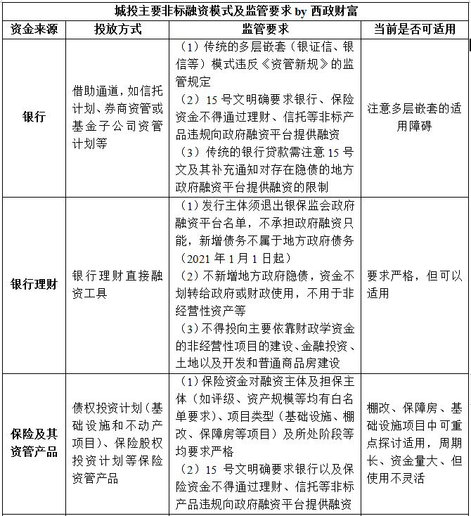2021年7月監(jiān)管部門下發(fā)的《銀行保險機構進一步做好地方政府隱性債務風險防范化解工作的指導意見》(銀保監(jiān)發(fā)〔2021〕15號,下稱“15號文”)及其補充通知,針對地方政府隱性債務監(jiān)管進行新一輪政策收緊,明確了非標投資的“禁區(qū)”的同時,進一步扎緊了城投非標融資的“緊箍咒”。2022年開始《關于規(guī)范金融機構資產管理業(yè)務的指導意見》(銀發(fā)〔2018〕106號,下稱《資管新規(guī)》)正式實施,打破剛兌,持續(xù)壓縮非標存量規(guī)模仍將繼續(xù)。雖然城投非標的生存空間越來越小,但是在標債無法完全滿足城投企業(yè)的融資需求的情況下,短期內城投非標仍舊有一定的生存空間。對此我們在梳理城投主要非標融資模式(信托、資管計劃、融資租賃、基金、債權融資計劃、理財直接融資工具、債權投資計劃、資產支持計劃及其他非銀金融機構借款等)監(jiān)管要求下,對尚合時宜的非標融資模式進一步整理,以供溝通探討。