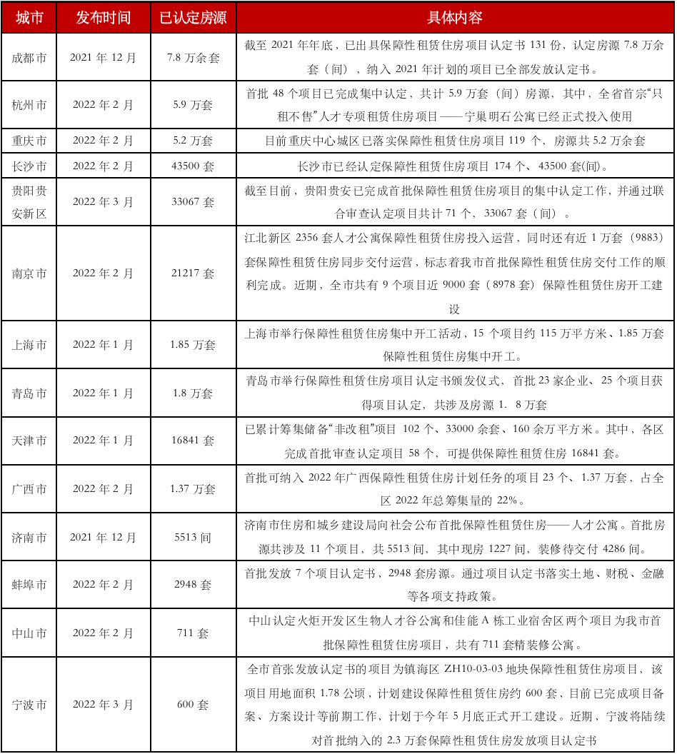 為加快落實保障性租賃住房籌建工作,多地紛紛成立保障性租賃住房工作領導小組,建立部門聯審機制,召開保障性租賃住房聯合審查會議,對申請保障性租賃住房項目進行集中研究討論。2021年底至今,多個城市陸續發布完成了本市首批保障性租賃住房項目集中認定工作,據克而瑞不完全統計,13個地市發布已認定的保障性租賃住房房源超32萬套(間)。2022年保租房將迎來爆發式增長,保租房項目認定工作也將加速推進。