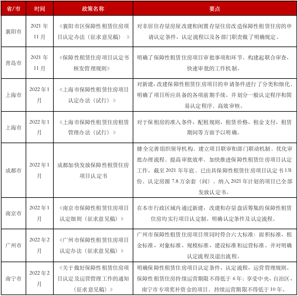 為加快保租房籌建進度和規范保租房市場健康穩定發展,上海、廣州、南京、青島等城市陸續發布保障性租賃住房項目認定辦法與管理辦法,明確保障性租賃住房項目準入條件、運營標準、退出規則以及審批事項和環節等,構建聯合審查、快速審批的工作機制,確保“十四五”保障性租賃住房目標按時保質保量完成。