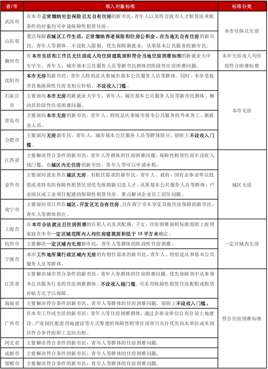 • 對象標準:關于保障性租賃住房準入對象上各城市存在較大差異,具體可以分為本市社保+無房、本市無房、城區無房、一定區域內無房、符合住房困難標準五大類。