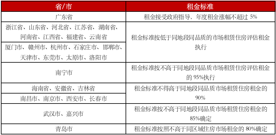 (3)明確保租房租金不高于同地段同品質市場租賃住房評估租金的95%或90%。海南省、安徽省、吉林省,以及南昌市、南京市、西安市、長春市、南寧市等省市將租金標準進一步量化,數值區間大致低于市場價的5%~10%。