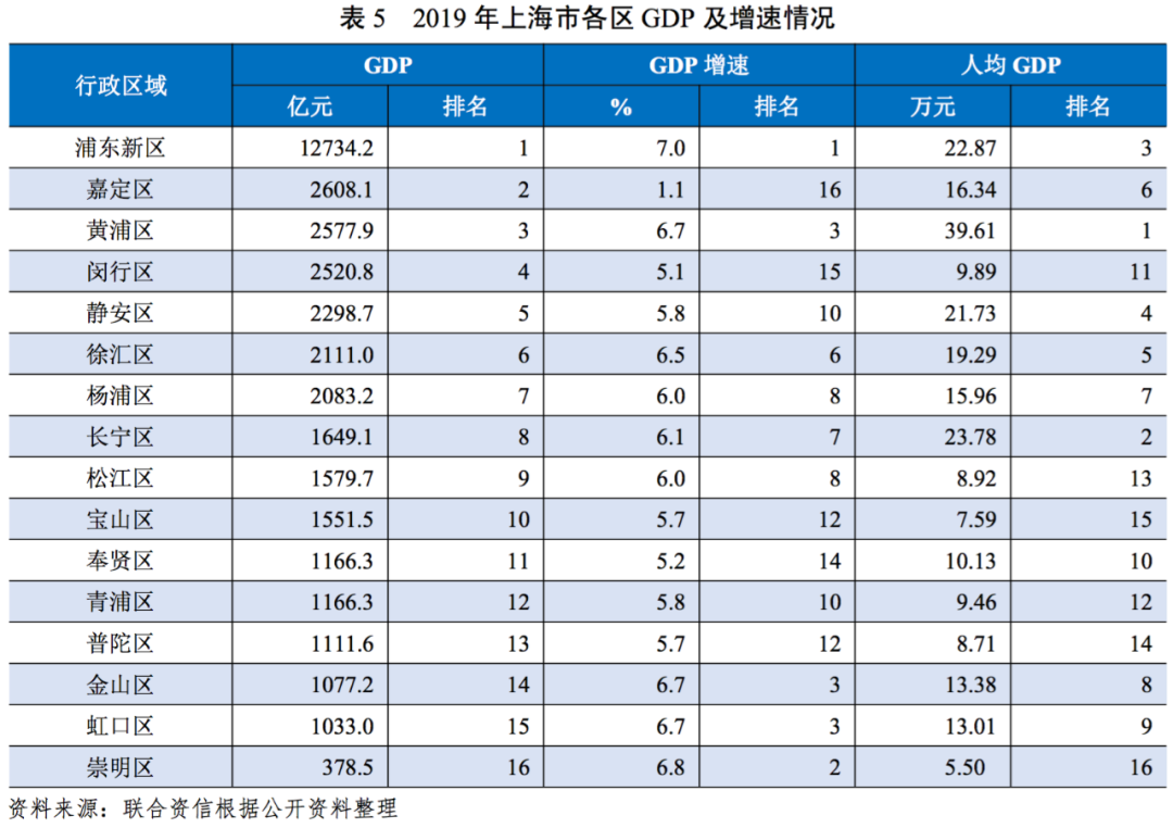從GDP增速來看,2019年,浦東新區、黃浦區、徐匯區等9個區GDP增速達到6.00%以上,閔行區、靜安區、寶山區等6各區GDP增速在5.00%~6.00%之間。嘉定區GDP增速最低,為1.1%。整體看,上海市各轄區GDP仍維持較高增速。