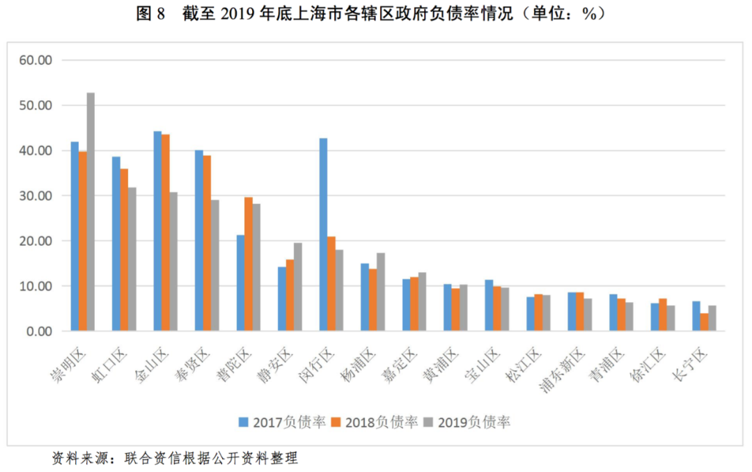 債務負擔方面,截至2019年底,崇明區負債率最高,達52.80%,其余各區負債率均在35%以下。從變化情況來看,2019年崇明區負債率較上年提升13.1個百分點,靜安區、楊浦區、嘉定區、黃浦區和長寧區負債率均較上年提升5個百分點以內,其余10個轄區政府負債率較2018年均有不同程度的下降,其中金山區和奉賢區下降程度相對較大,分別減少12.80和9.84個百分點。總體看,崇明區債務負擔較重,其余各區政府債務負擔處于較輕或輕的水平。
