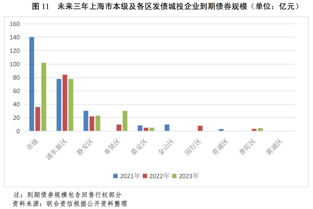 上海市本級、浦東新區和靜安區的城投企業2021年到期債券規模占一般公共預算收入比重分別為4.12%、7.28%和12.32%,占政府性基金收入的比重分別為20.96%、19.31%和27.06%,一般公共預算收入及政府性基金收入對到期債券的覆蓋情況較好;以城投企業2021年到期債券占2019年地方政府綜合財力的比重來近似衡量2021年城投債券的到期償還能力,上海市本級、浦東新區和靜安區城投企業2021年到期債券占地方政府綜合財力的占比分別為3.34%、4.32%和8.44%。總體看,上海市本級和各區城投企業2021年到期債券的償還能力很強。