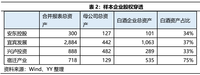 此外,需要從母公司層面追溯主要融資投向和資產(chǎn)形成。從財務(wù)特征來看,白酒類產(chǎn)投平臺的合并報表普遍失真,白酒更多是作為美化報表的作用。由于產(chǎn)投平臺并表或持股優(yōu)質(zhì)白酒公司,且旗下通常由不同的子公司負責不同業(yè)務(wù)板塊的經(jīng)營,母公司的資產(chǎn)規(guī)模遠遠不及合并口徑的資產(chǎn)規(guī)模,資產(chǎn)質(zhì)量與優(yōu)質(zhì)白酒股權(quán)也存在不同程度的極差。