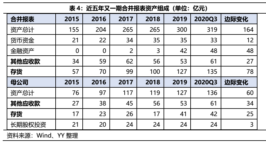 2015到2020Q3,從資產(chǎn)端來看,母公司主要的變動科目是其他應(yīng)收款和存貨,分別增加了34億元和25億元,對應(yīng)負債端,主要是其他應(yīng)付款和有息負債,分別為28億元和24億元。