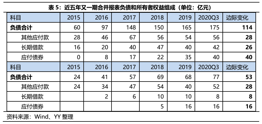 因此,無論從負債端還是資產(chǎn)端,由于白酒股權(quán)對報表的美化作用,母公司的報表更為獨立,故下文將進一步追溯母公司近五年的報表組成,分析公司的舉債和資產(chǎn)形成過程。