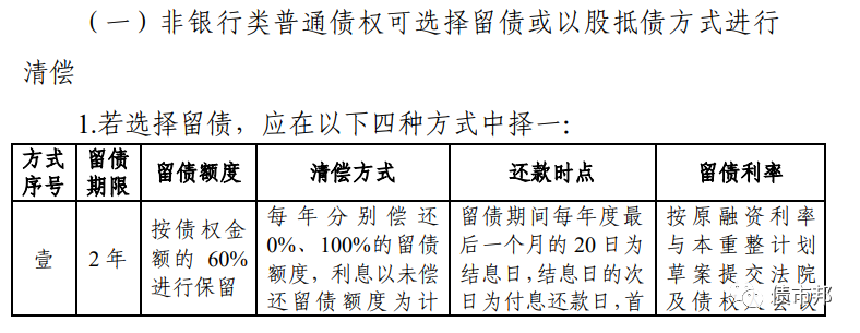 鹽湖的非銀機構債權人,既可以選擇債轉股,也可以選擇留債現金清償,其中現金清償可以選擇5年拿回100元的本金,4年拿回80%的本金,3年拿回68%的本金或是2年拿回60元的本金,機構可以根據自己的持倉成本和負債穩(wěn)定性自主選擇現金償債方案。