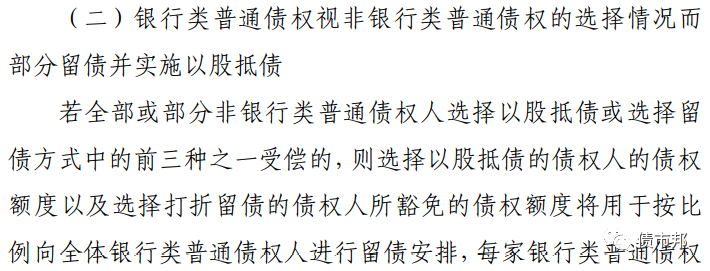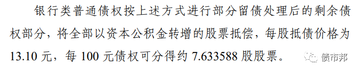 根據破產重整方案,商業(yè)銀行只能獲得非銀機構放棄的債權的現金清償權利,也就是前文所述的11.8億元,對于商業(yè)銀行持有的幾百億債券而言是杯水車薪。所以絕大多數商業(yè)銀行債權都只能被迫債轉股。