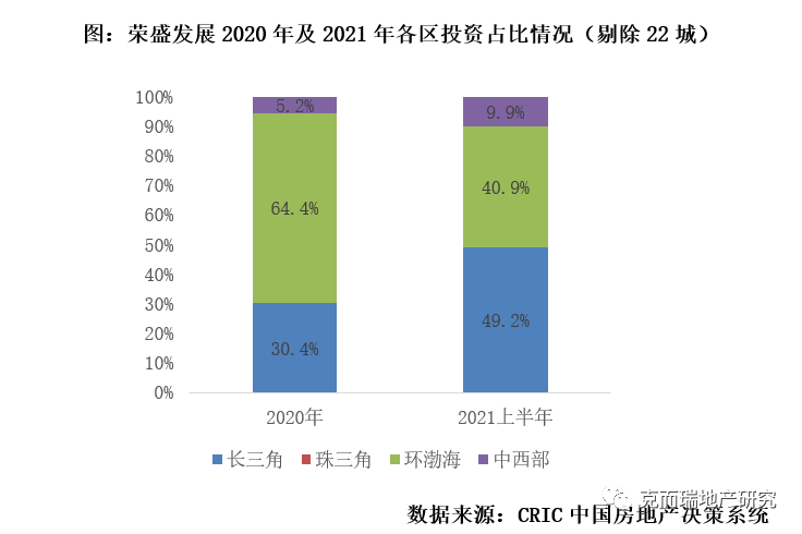 榮盛、金科調整區域布局,避開長三角、珠三角熱門城市,尋求三四線城市投資契機。榮盛起家于河北,金科起家于重慶,從二者近年來的布局來看,企業正積極調整投資布局,弱化大本營投資,向長三角、珠三角等熱點區域進軍。然而由于土地市場持續高熱,競爭壓力較大,作為新晉房企,榮盛和金科選擇避開熱點的22城,尋求其他三四線城市布局契機。根據CRIC監測,2021年上半年榮盛發展非22城拿地金額占比達61.3%,明顯高于TOP50房企平均水平的36.6%。