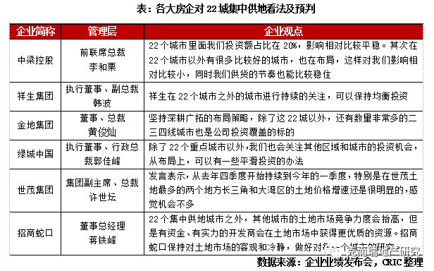 中梁、祥生、金地、綠城表示要尋求22城之外投資機會,招商蛇口、世茂直言部分熱點區域土地價格被抬高。在房企的年終業績發布會上,“雙集中”供地后的土地投資策略是被提及最多的問題之一,謹慎、中性、保持節奏是多數房企的回答。其中中梁、祥生、金地、綠城等房企提出除了關注22城集中供地之外,還要尋求其他城市的投資機會來平衡投資。而世茂管理層則直言長三角和大灣區土地價格增速明顯,感覺機會不多。招商蛇口也表示其他城市土地競爭力抬高,要保持客觀冷靜的投資態勢。