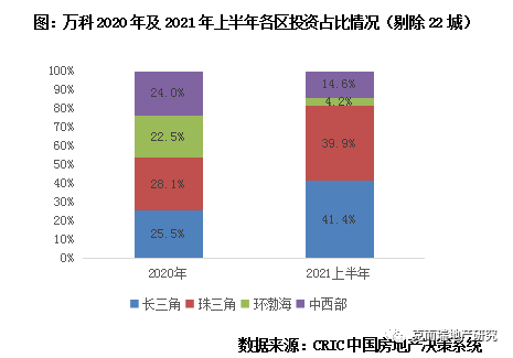 基于長三角、珠三角的發展前景,萬科下沉兩地非22城尋求投資契機。根據CRIC監測,在保持了一定投資力度的前提之下,上半年萬科投資力度向非22城傾斜,占比相比2020年上升了9.3個百分點達到了62.0%,上半年并未在一線城市納儲。并且萬科則出現了非常典型的區域集中情況,2021年上半年,萬科非22城投資金額中超過8成投向了長三角、珠三角兩大區域,以金華、溫州、中山等熱點城市為主,相比2020年的均衡型投資有明顯調整。不過在6月底,萬科進行了新的組織架構變革,由五大區裂變成七大區,主要是將北方區域裂變為北京、東北,中西部裂變成華中、西南區域,組織先行,未來企業仍有望擴大兩地拿地份額。