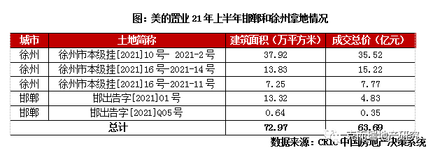 美的置業持續鞏固深耕優勢城市,上半年僅在22城斬獲一幅土地。美的置業同樣采取深耕策略,不過與中梁、祥生不同的是,美的置業持續加碼自身的高市占率城市。企業2010年走出珠三角,其全國化布局便是從長三角的徐州開始,之后進駐邯鄲,根據CRIC的統計,2020年美的置業在兩城的市占率均居首位。2021年上半年,美的置業持續擴大在徐州和邯鄲的布局,分別拿下3幅、2幅土地,合計拿地金額達63.69億元。