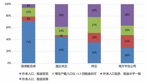 而地方平臺公司拿地一般以“托底”為主,而外來人口、租金雙低的城市更需要托底,因此占比最高,達到36%,與此同時地方平臺公司在外來人口和租金雙高的城市持有租賃用地的比例在各類型企業中最低。可見地方平臺公司拿地的對盈利性的要求相對較低,主要是為保證地方租賃用地供應計劃的完成。