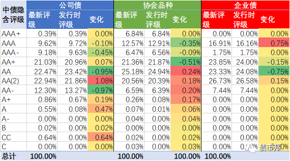 我們來看看,2021年發行的三大信用債品種(剔除SCP)的最新的隱含評級分布,以及與發行時候隱含評級變化的情況。