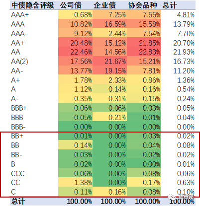 協會品種方面,AAA、AAA-和AA+的占比下滑了0.95%,而AA、AA(2)等較低隱含評級的占比顯著提升;